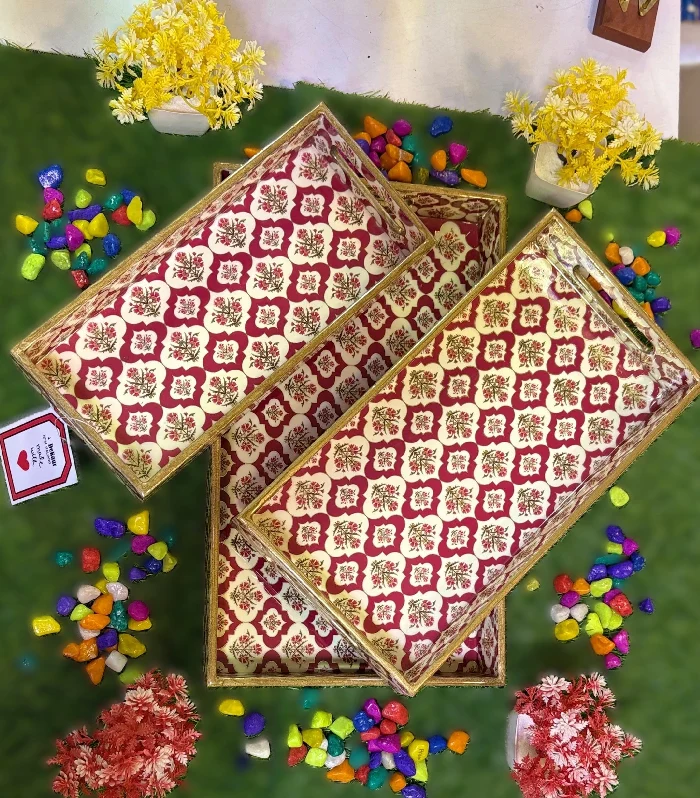 Bring a touch of traditional charm and elegance to your home with this beautifully handcrafted wooden tray set. These trays are perfect for serving or as stylish décor accents. Made from high-quality wood with a durable laminated finish, the trays combine functionality with artistic appeal.