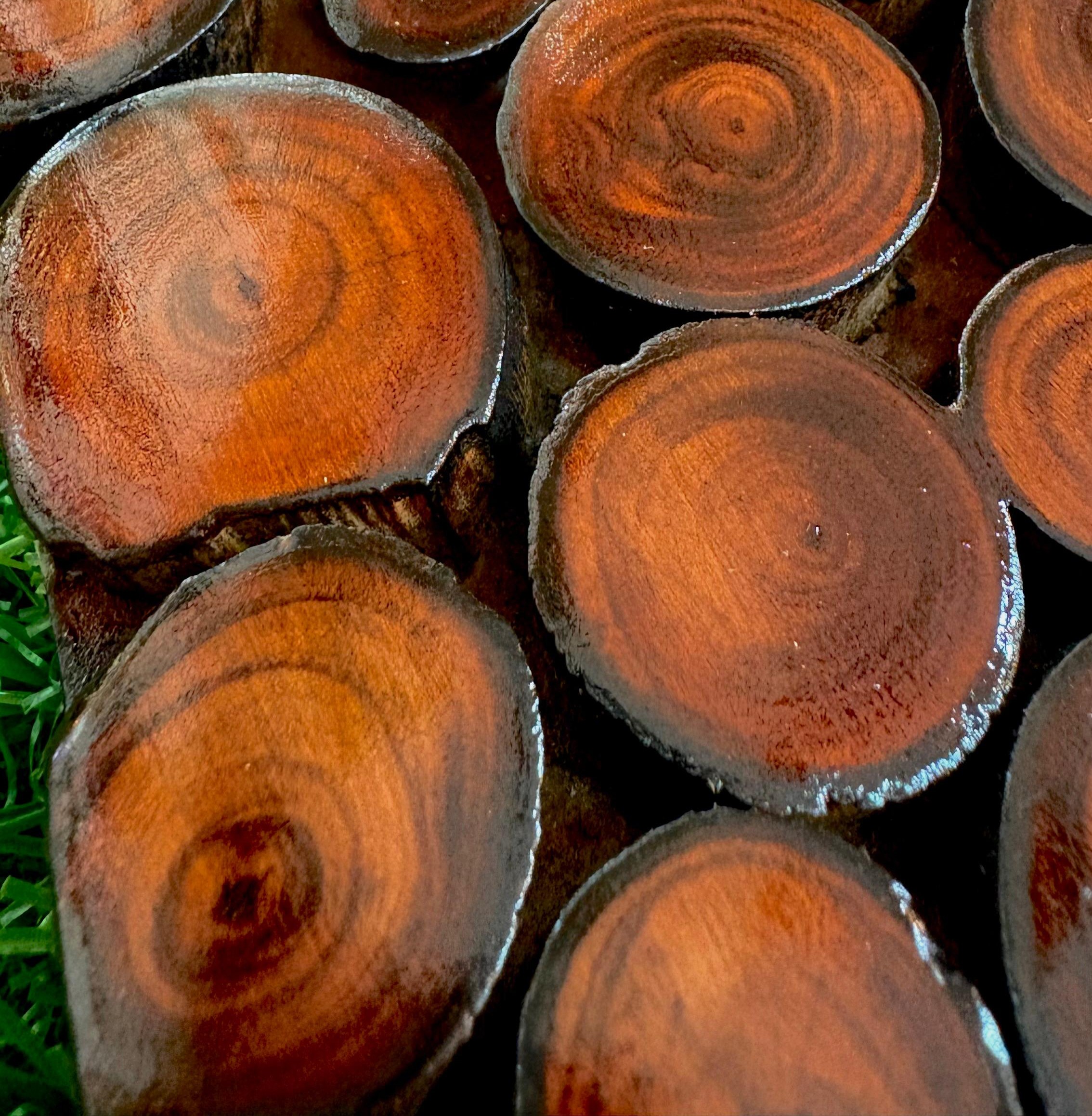 Features an attractive wooden log slice background arranged in a symmetrical octagonal frame.