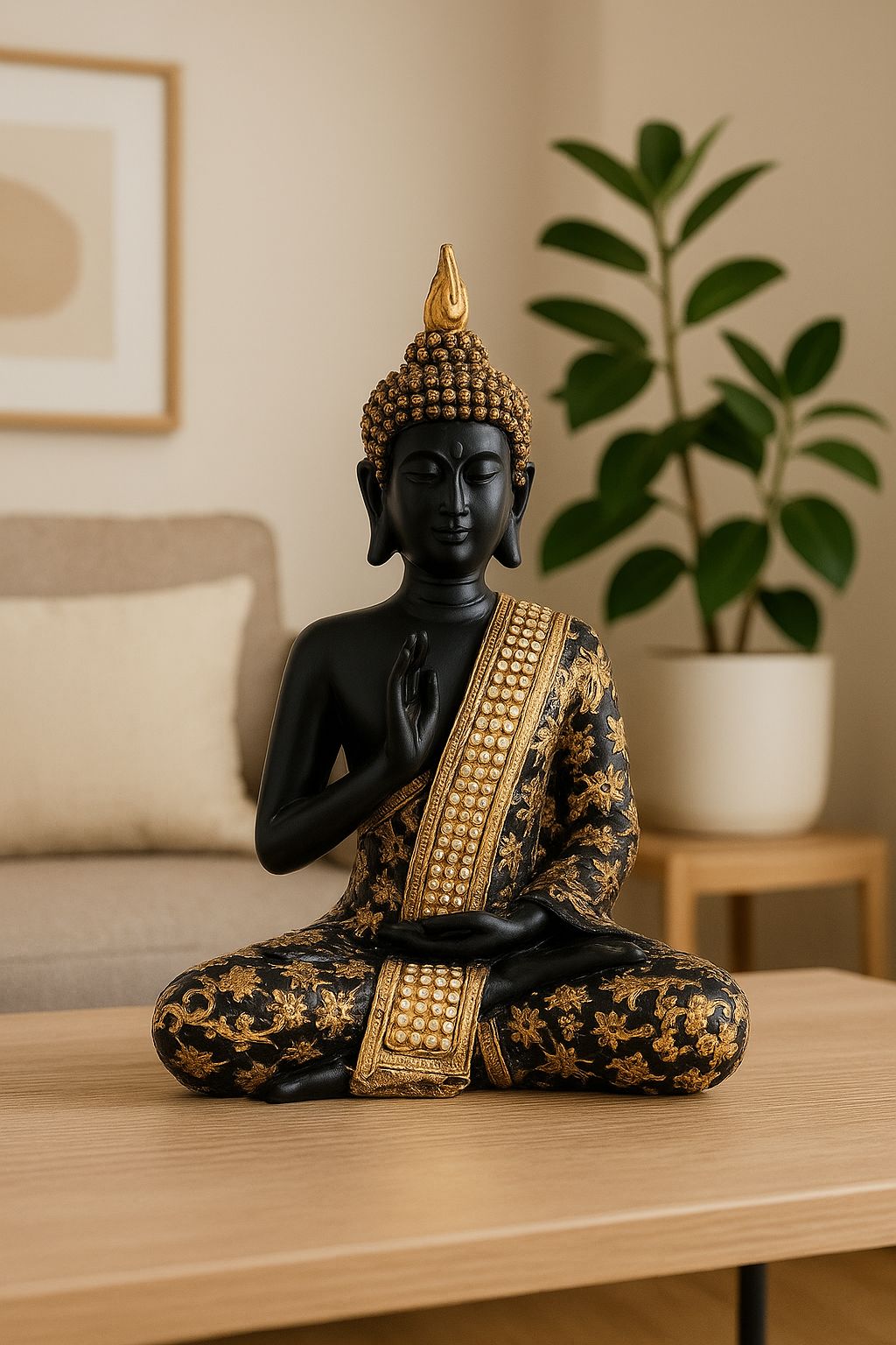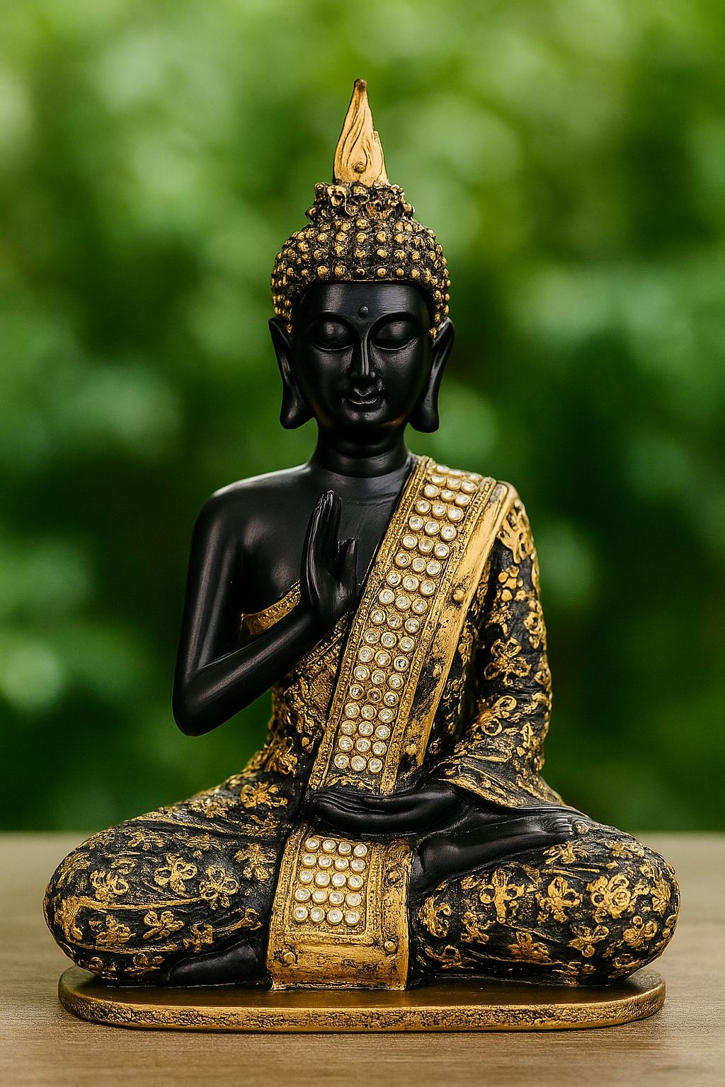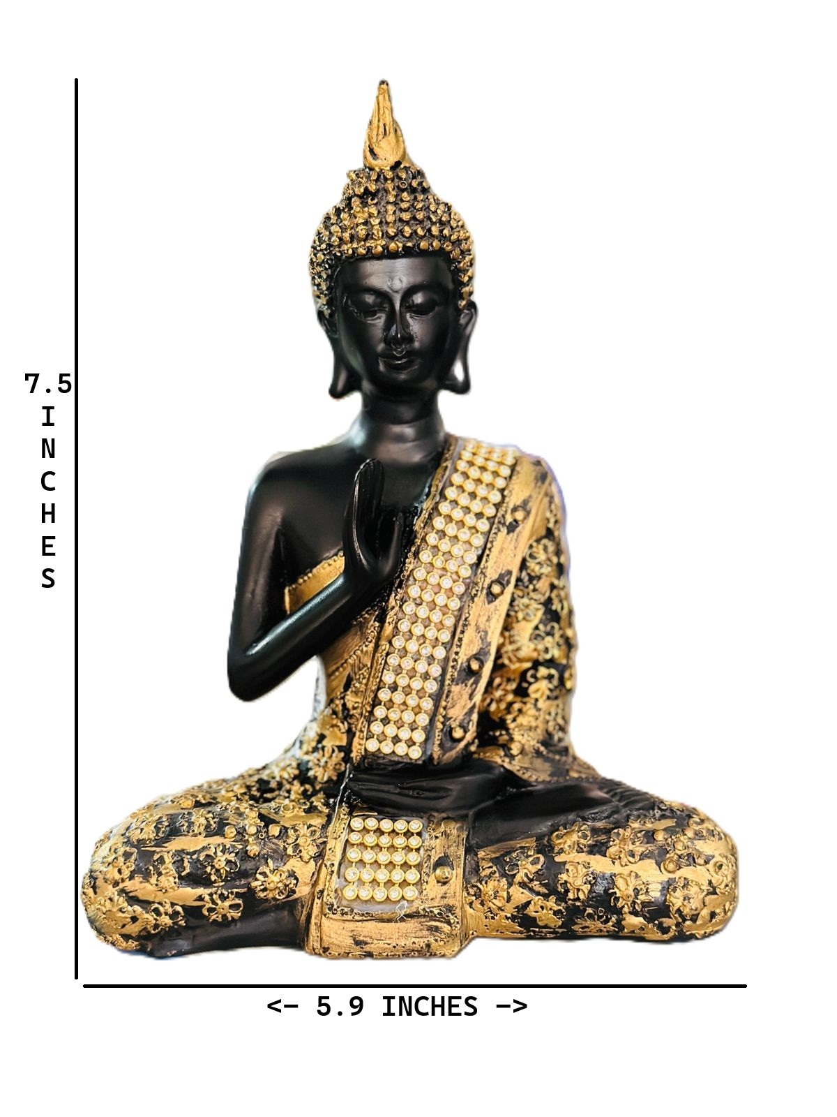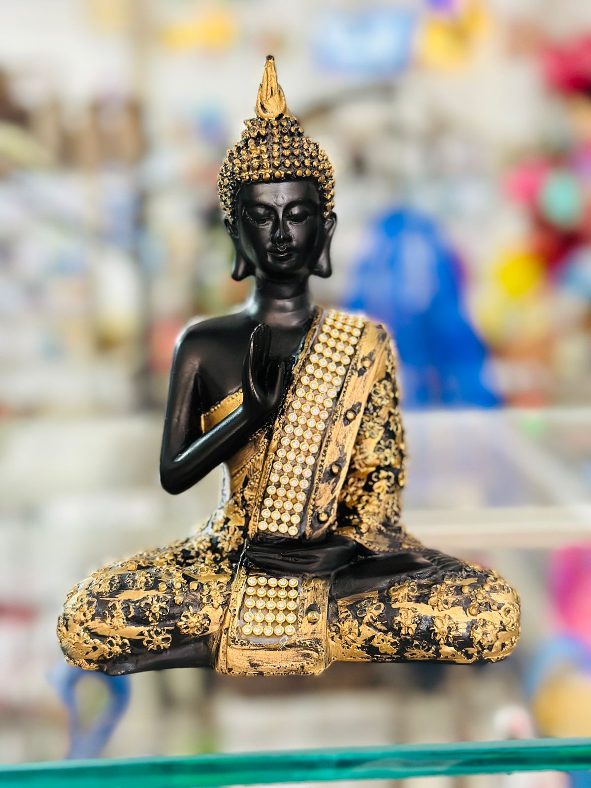 Add a touch of elegance, peace, and spiritual energy to your space with this stunning Black & Gold Buddha Statue, intricately designed with detailed floral patterns and stone embellishments. Made from high-quality Polyresin, this beautifully crafted piece showcases the Buddha in a meditative pose, radiating calmness and serenity.