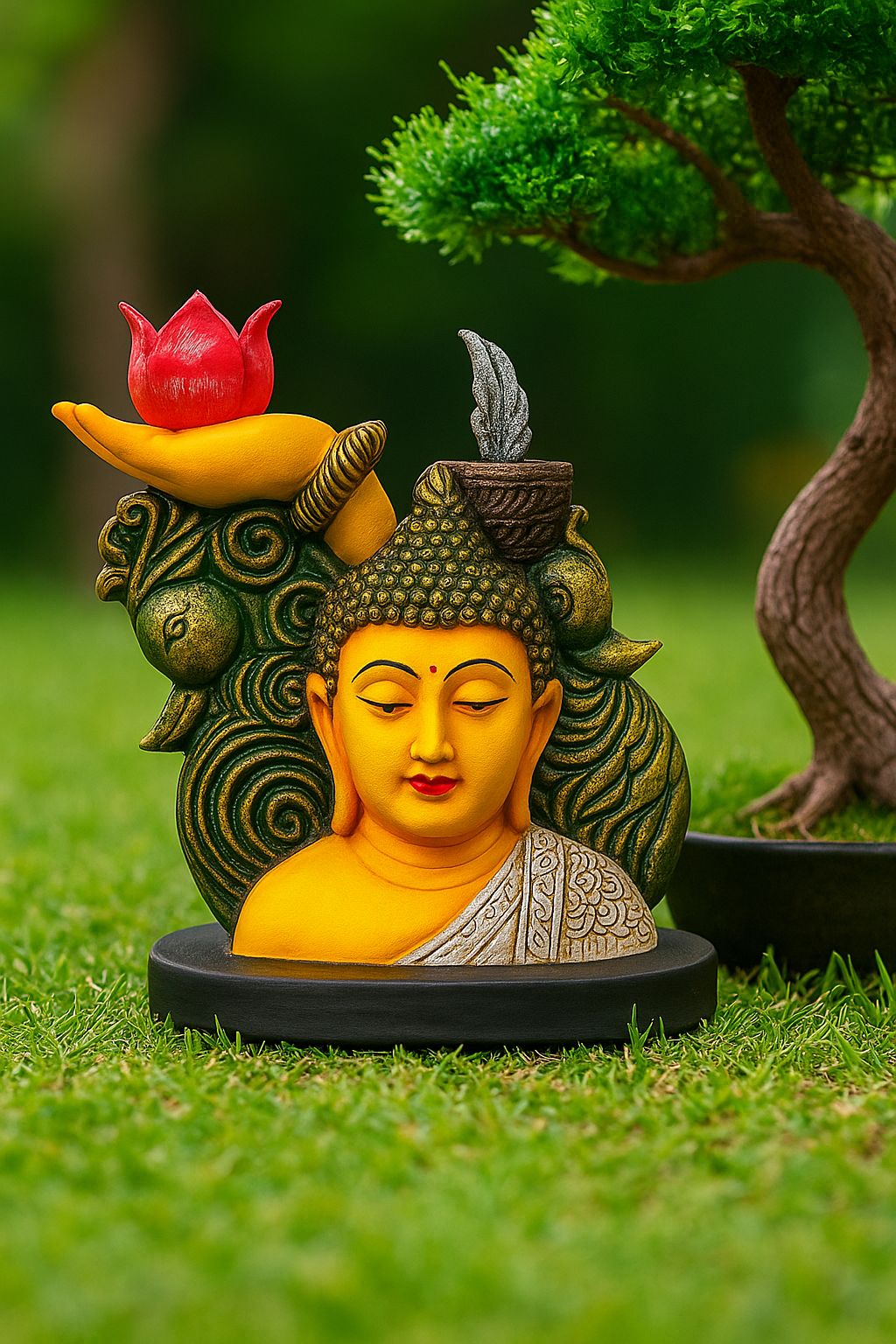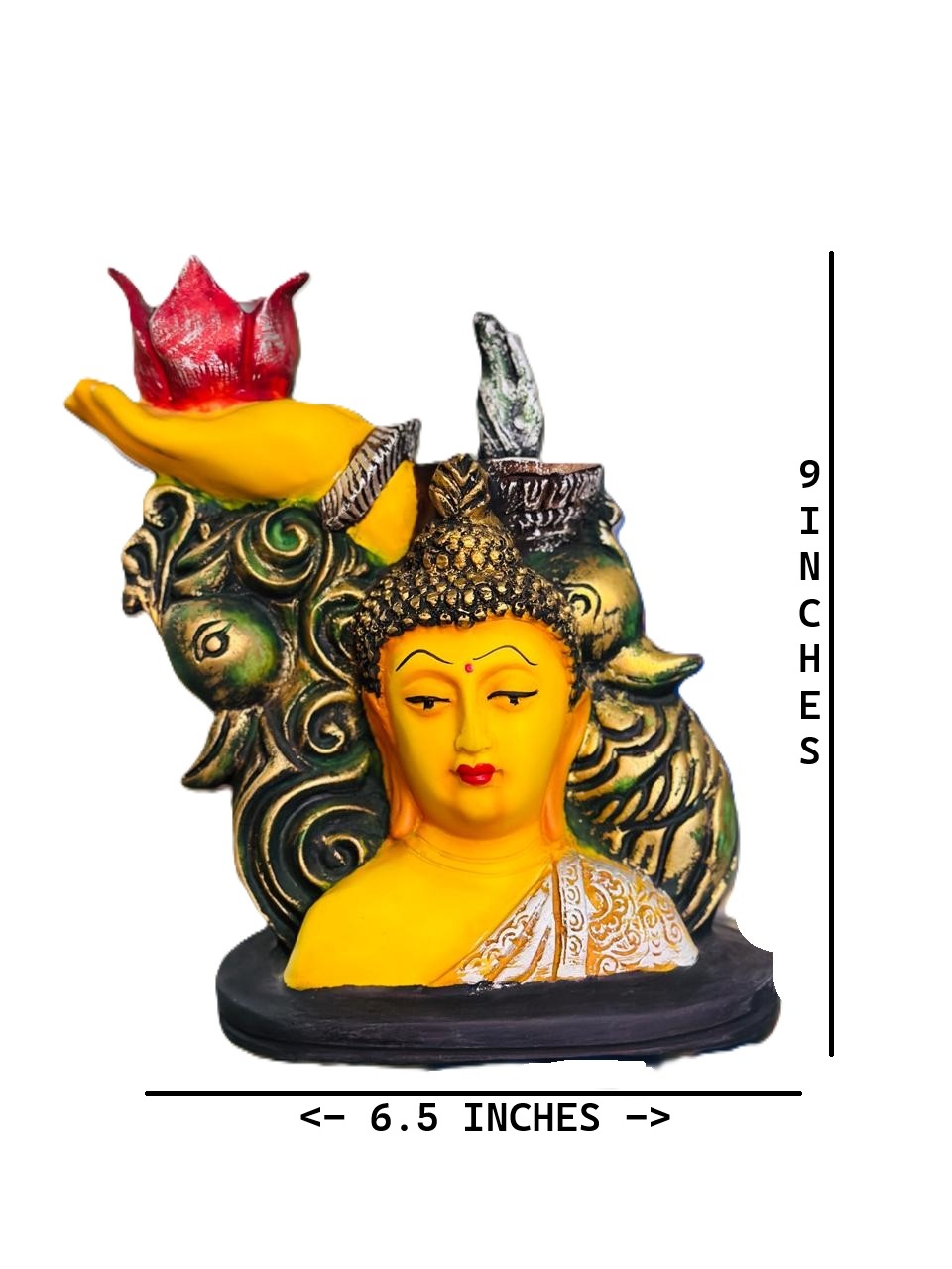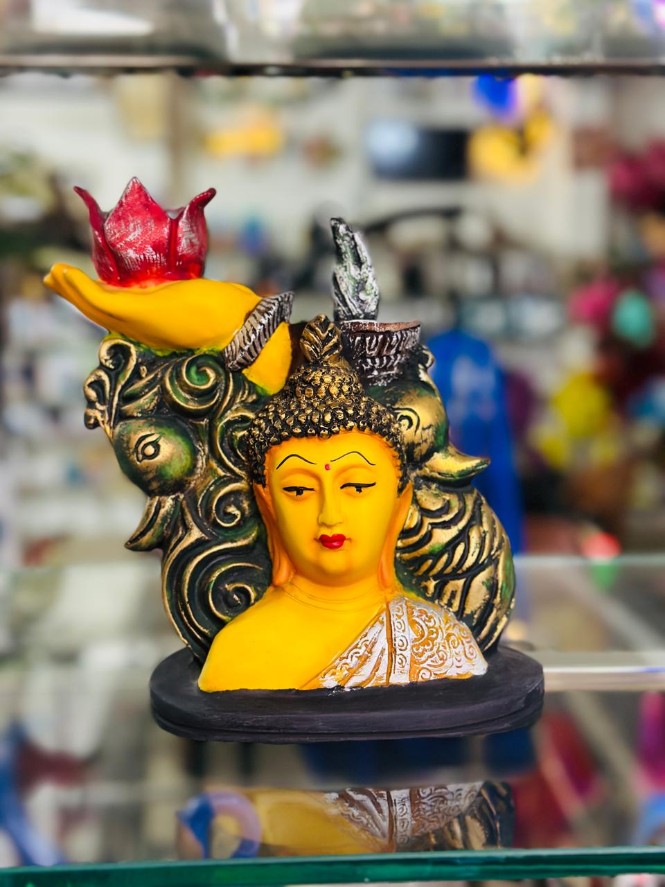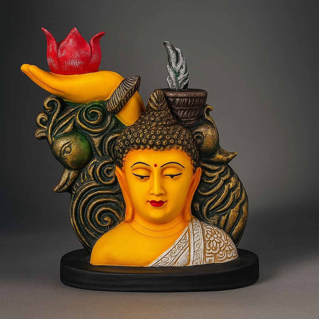 Bring peace, positivity, and elegance into your living space with this beautifully crafted Buddha Head Idol with Lotus and Hand Sculpture. Designed with intricate details and vibrant colors, this statue features a serene Buddha face surrounded by artistic elements like a symbolic hand holding a red lotus, detailed swirls, and natural motifs. The idol is ideal for creating a calm, meditative environment in your home, office, or garden.