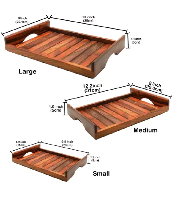 Upgrade your serving experience with this beautifully handcrafted wooden tray set, made from premium Sheesham wood (Indian Rosewood) known for its durability and rich grain patterns. This set includes three versatile trays in different sizes, perfect for serving food, drinks, snacks, breakfast in bed, or enhancing your home décor.