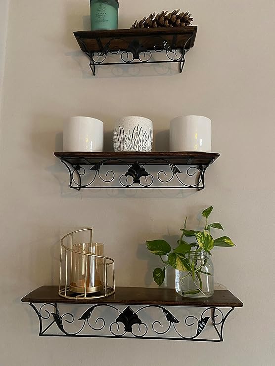 Enhance your home decor with this beautifully handcrafted Set of 3 Wooden and Iron Wall Shelves. Designed to bring elegance and functionality together, each shelf features a solid wooden top supported by intricately curved black wrought iron brackets. These wall slabs are perfect for displaying small décor items like photo frames, plants, candles, figurines, or religious idols. Whether used together as a set or individually, they make a stylish statement on any wall — from living rooms and bedrooms to hallways or office spaces.